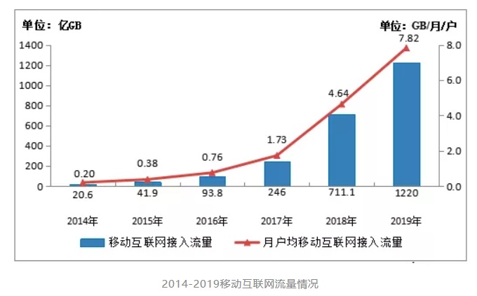 工信部在对最新通信业数据解读中提到,2019年,移动支付、移动出行、视频直播、短视频、餐饮外卖等线上线下融合应用不断拓展新模式、新商圈、新消费,这带来了移动互联网接入流量消费保持较快增长。2019年,移动互联网接入流量消费达1220亿GB,比上年增长71.6%;全年移动互联网月户均流量(DOU)达7.82GB/户/月,是上年的1.69倍。电信企业的流量数据监测表明,2019年移动用户使用抖音、快手等短视频应用消耗的流量占比已超过30%。