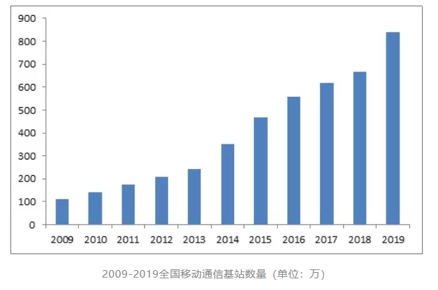 根据工信部每年度统计公报的数据,2009年我国的移动通信基站为111.9万个,到2019年底这一数字已达到841万个,10年时间增长了6.5倍。基站作为基础设施,也从一定程度上反映了通信业固定资产投资的速度。