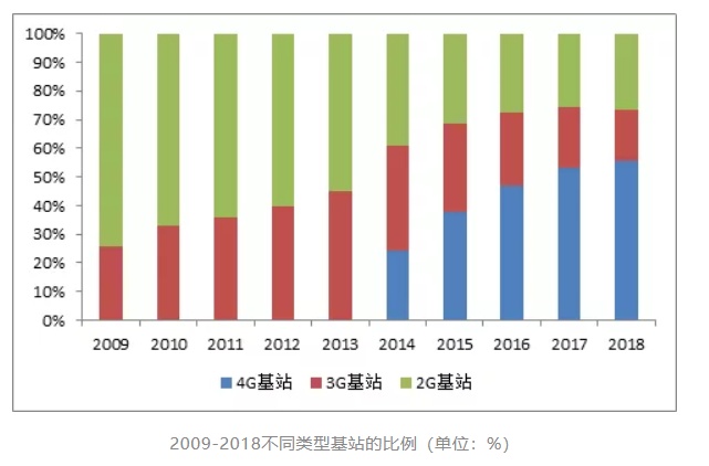 在从111.9万增长到841万过程中,通信基站的结构也在不断发生着变化,典型的是经历了从2G基站为主到4G基站为主的变迁过程。