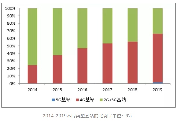 2019年5G基站所占比例虽然不足1.6%,但随着5G商用的加速,全国移动通信基站的结构也会发生明显的变迁。