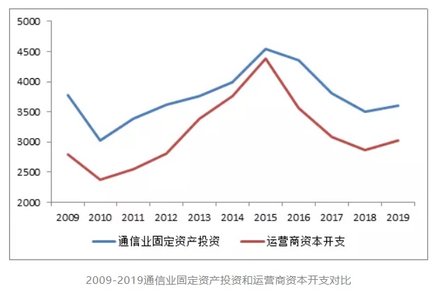 三大运营商在每年的财报中会公开其资本开支的数据,虽然运营商的资本开支并不一定等于固定资产投资,但两者具有非常密切的关系。我们选取2009-2019通信业固定资产投资和三大运营商资本开支的数据来考察。