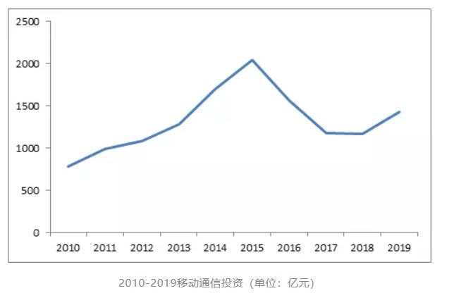 由于移动通信的投资是通信业固定资产投资和运营商资本支出的核心部分,通过移动通信投资的趋势可以预期未来数年后5G投资的趋势。上图显示2010-2019年运营商对移动通信方面的投资金额,明显看出2019年是上升的拐点。