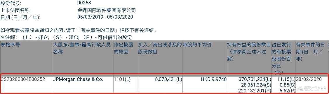 智通财经APP获悉,根据联交所资料显示,2月28日,摩根大通增持金蝶国际(00268)约807.04万股,每股作价9.9748港元,总值约8050.06万港元。增持后最新持股数目约3.7亿股,最新持股比例为11.15%。
