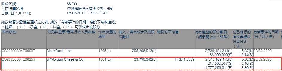 智通财经APP获悉,联交所最新资料显示,2月28日,摩根大通增持中国铁塔(00788)约3379.63万股,每股作价1.8889港元,总金额约为6383.79万港元,增持后持股数目约为23.43亿股,持股比例为5.02%。