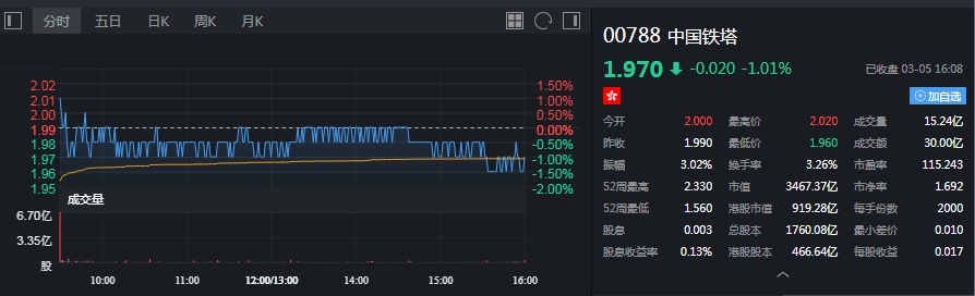 截至今日收盘,中国铁塔跌1.01%,报1.97港元。