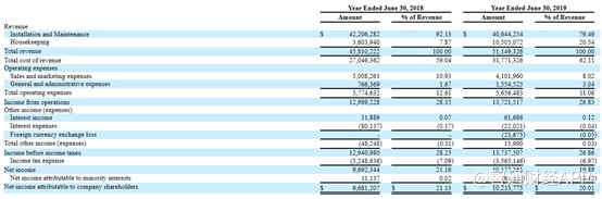 细分业务来看,在2018财年,家电维修和安装业务的收入为4220.63万美元,占财年营收的92.13%;家政服务收入360.39万美元,营收占比为7.87%;而到了2019财年,家政服务的收入有显著的提升,达到1050.51万美元,营收占比达到20.54%,而家电维修和安装业务收入较上个财年有所下滑,收入4064.43万美元,占比滑坡至79.46%。