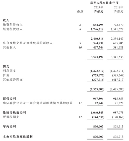 经营费用跟随营收同步增长,所得税开支减少使得净利润增长提速。智通财经APP了解到,2019年经营开支中占比最大的利息开支,录得与去年同比持平的14.23亿元,而折旧费用则大幅增长29%至7.55亿元,公司表示是由于经营租赁项下飞机数量增加导致的。同时,由于采纳新的香港财务报告准则第16号,导致原本过往年度是计入其他经营开支的1980万元使用权资产折旧开支,2019年列入了折旧一栏,所以就出现了折旧费用大幅上涨,而2019年其他开支一项则同比下滑9.5%至3.78亿元,整体经营开支达到了25.56亿元,5.4%的同比增速与营收增长同步。不过由于过往已计提出售一些飞机税项拨备的拨回,年内递延所得税一项同比减少36.9%至8084.4万元,让所得税开支整体下滑18.9%至1.45亿元,使得净利率由去年的24.2%提升至25.4%,最终净利润录得10.8%至8.96亿元。
