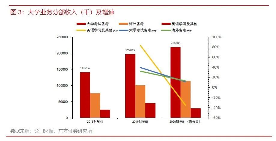 大学业务处改革调整期,公司决心力度大+执行力强。公司从2019年4月起决定大力改善产品线,在报告期内,即调整半年内,公司已完成将大学业务重心聚焦到国内考试和国外考试业务2条主线,砍掉英语产品线。其中大学备考20H1收入为2.4亿(yoy+23.7%),海外备考1.13亿(yoy+12.9%)。而原有的英语业务板块,裁减掉部分英语类产品后,将具有较强市场需求的英语学习产品并入到了国内考试产品线,因此原口径下英语培训业务增速下滑较为明显。若按照原有口径披露,大学备考实际增速为11%,较去年同期39%的增速下滑28个百分点(其中占一半收入的考研业务收入同增10.8%);海外备考增速为12.9%,较去年同期32.3%的增速下滑19.4%;英语学习及其他增速为-36%,去年同期为83.5%。收入整体下修,因整体学费有递延作用,我们预计改革对20H2大学收入影响也较大(具体下调数据见下文盈利预测)。