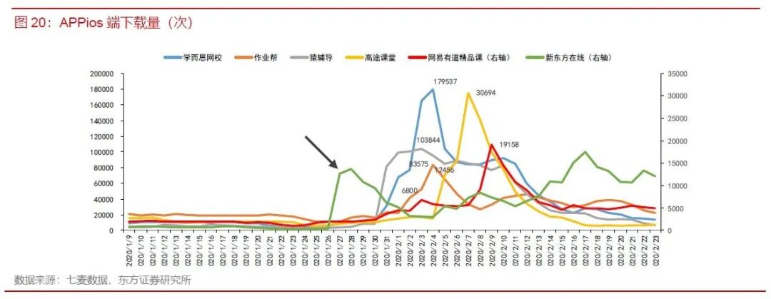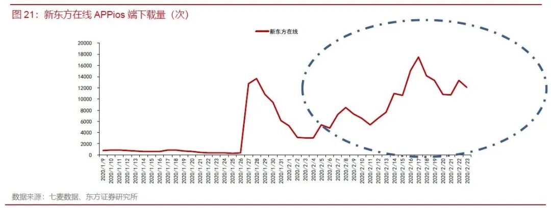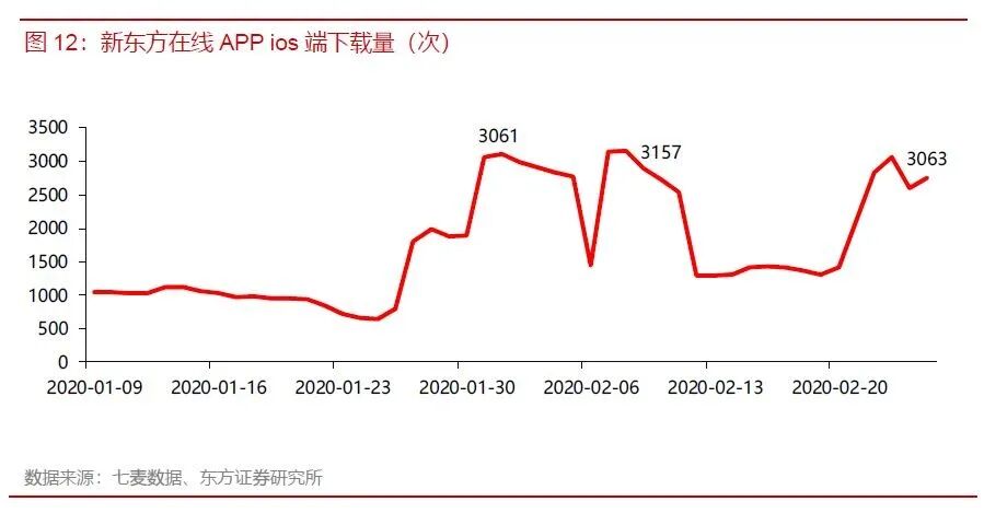 新东方在线APP下载量波动式上升。新东方在线APP主要针对大学业务的用户开发,跟踪七麦数据,ios端新东方在线下载量开始逐步上升,2020年2月2日到达第一个峰值3061次,单日下载量为平日的3倍左右,随后分别出现两个峰值分别达到3157/3063次。由于新东方在线APP涉及四六级、托福/雅思、考研、小语种等课程,即除K12的所有课程,各免费课程开课时间不同,且录播课程为随到随学,不同于K12直播开课前人次迅速提升,因此我们看到新东方在线APP下载量波动上行,没有明显的爆发时点。
