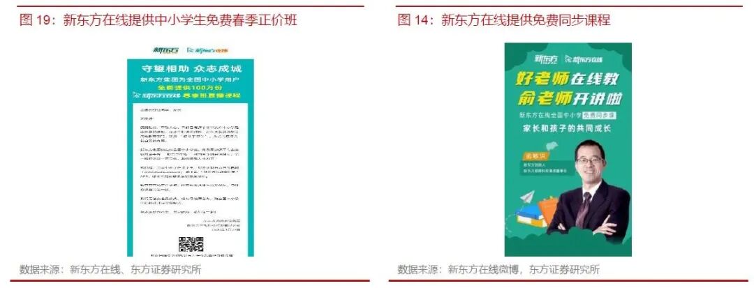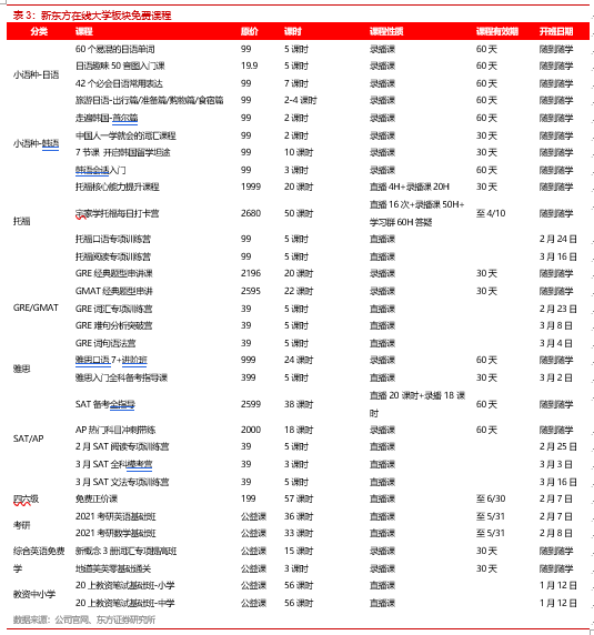 新东方在线推出同步/春季两类免费课程,助力“停课不停学”。在事件发生后,新东方在线在1月27日推出春季免费课程,宣布提供100万份新东方在线春季班直播课程(实际发放超过100万份),持续时间为2月15日至5月30日,覆盖整个春季学期,并全部停止了正价春季课的销售。随后,2月6日宣布提供免费开放同步课+家长讲堂,持续时间为2月7日至结束。对比其他在线机构,学而思猿辅导作业帮的免费课课程时间为2月到结束,没有配套服务,而新东方在线持续到6月,且服务质量与正价双师大班保持一致。从行业流量趋势来看,我们预测新东方在线大班实际上课人次超千万,后续依托整个春季提供的正价式服务+持续产品打磨+新东方品牌,暑期和秋季非常值得期待。