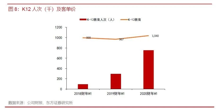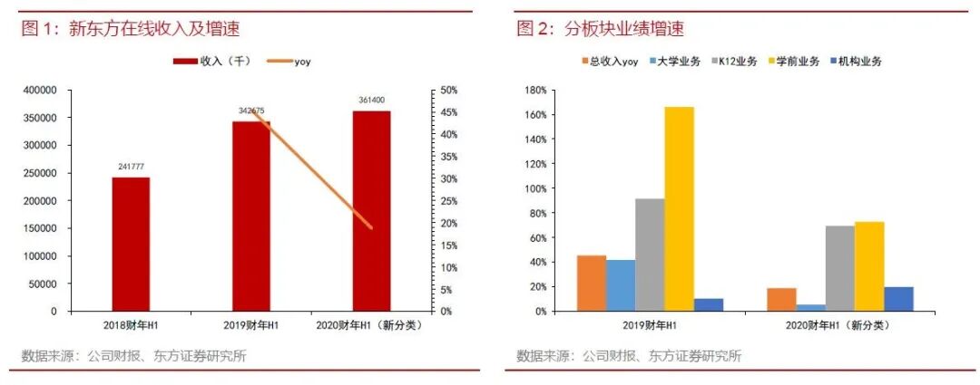 新东方在线(01797)收入增速放缓主要因20FY为公司架构及产品调整大年,改革力度大、执行力强且到位超出我们预期,调整为公司长期加速发展做充足准备。公司FY20H1净收入5.67亿元(yoy+18.8%),主要因收入占比64%的大学业务收入增速从41.7%下滑至5.5%。而K12业务持续表现亮眼。