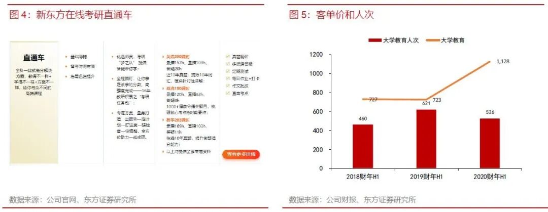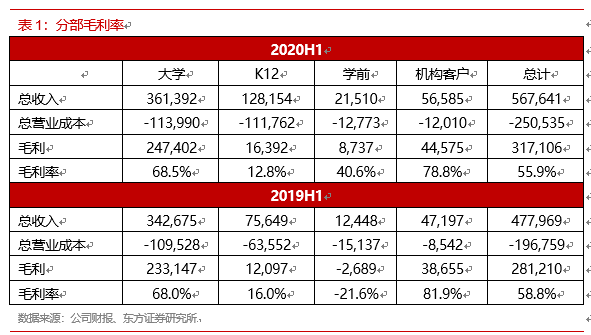 产品从录播课向直播升级,客单价上行。新东方在线将原有录播课程,逐渐升级为直播+录播相结合,课程单价显著提升,人均付费提升到1128元(19H1为723元),同比提升55.3%。2019H1人次为52.6万,同比下降15.3%。因整体定价更高,产品升级有效拉升了业务毛利率,20H1大学板块毛利率增加0.5%至68.5%。后续公司大学将继续引入高质量课程,并结合双师模式,课堂体验将进一步得到提升。