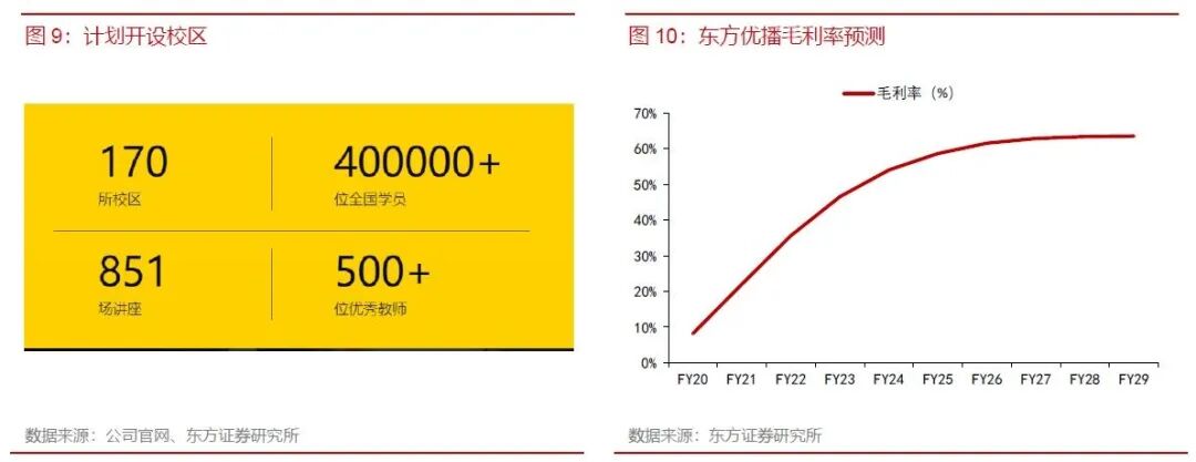 优播模式已跑通,收入利润将逐步释放。东方优播下沉动作迅速,截止11月30日,优播已进入23个省128个城市(公司官网显示170门店已经在计划中),20和21财年将是公司扩张的高峰,每年新增网点预计在80-100个。根据财报后电话会议的QA,从过往三年门店的经营情况来看,优播模式基本跑通,关键指标表现优异。门店低价转化率在15~20%之间,三年期门店正价班班均已经提升到20人(一年/二年/三年:9/14/20)。随着班均的提升,一年/二年/三年期门店毛利率分别在10%/20%/30%左右,预计五年之后的成熟门店毛利率达到60%-65%,与传统线下小班模式相近。优播20H1毛利率5.3%,FY19H1为-25%,相对去年增幅较大,说明优播线上小班模式已基本跑通。
