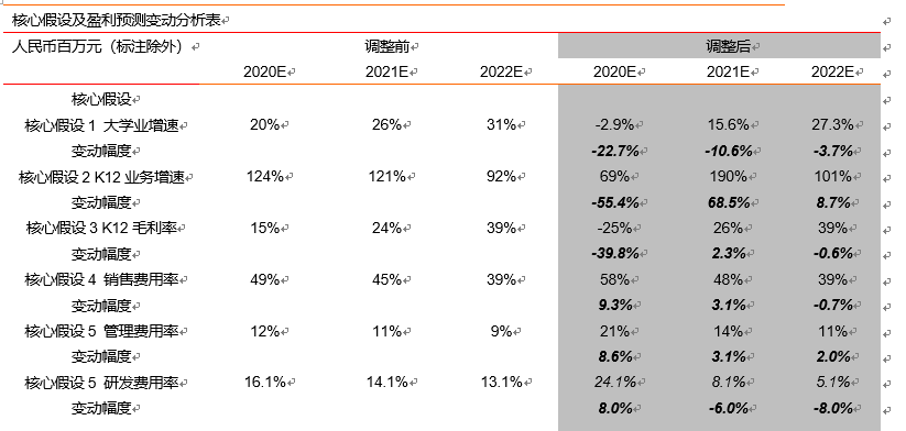 东方优播:相比之前预期,由于三四线地区收入水平相对较低,体验类用户占比较高,调低东方优播的低价转化率,同时由于事件的影响,三四线线上优质培训资源更加稀缺,提升优播转介绍率,短期优播收入预期变化不变。长期来看,优播模式已经跑通,后续发展确定性较高,因此一方面我们扩大城市覆盖的预期,另一方面成熟网点将进行科目扩张,提升优播长期收入规模。新东方在线双师大班:当前双师大班业务变动较大,提供春季全程免费课程,因此20年春季收入为0(原预计~3000万),影响20财年收入表现。但随着通过各类营销手段,将免费课学员向正价课程转化,预计21H1人次增速将显著提升。基于上述因素,我们下修20FY K12业务增速至68.7%,上修FY21/22增速为189.9%/101%(原预测124.1%/121.4%/92.1%),其中FY21双师大班/优播增速分别为278%/173%。
