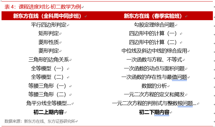 春季班较同步课配套服务和课程设计上更为精细。春季班和同步班具有一定差异性,主要体现在4个方面。在课程体系上不同,东方在线免费同步课内容与正常教学基本同步,每天全科均有涉及,为秋季课程复习;春季班为原来的春季正价班,配备辅导老师,非全科,分科目报名参加;在课程配套辅导上不同,春季班有专属班级群和辅导老师,而同步课程由于体量大,无法提供专属辅导;在课程版本上不同,同步课全国统一无选择,而春季课按年级细分版本,如初二数学有人教/北师版,高二化学有选修四/选修五;在课程内容上不同,春季班单科每周周末上课,每节课2h,是正常教学外的辅导补充,课程难度有一定拓展,而同步课是周一至周五上课,每节课45min,和正常教学一致,课程难度有所考量和和调整。因此,同步课是全国学生统一课程,而春季班适配不同学生群体,学生可根据自身情况选择。