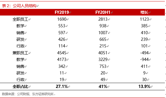 2020年起,公司策略就是聚焦产品线,以及重点产品线加大核心投入,无论课程研发、人员数量。我们看见公司的两个动作:1)大幅减少兼职人员绝对数及比例,保证教学质量及服务质量;2)为业务拓展,大幅度增加全职人员数量。公司在K12双师大班及大学业务投入大量全职老师&辅导老师(K12需辅导),同时全职员工占比提升,减少兼职。预计20 和21财年公司人力成本保持快速增长,后续业务形态稳定后,人力成本占比才会逐渐下行。