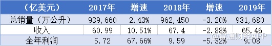据百威亚太2019年财报数据显示,公司于2019年实现收入65.46亿美元,较去年同期67.4亿美元下跌2.88%,实现同比1.8%的内生增长。而销量方面,百威亚太2019年销量共达931680万公升,较去年同期下降 3.0%。最终,百威亚太实现全年净利润9.08亿美元,同比下降5.32%。