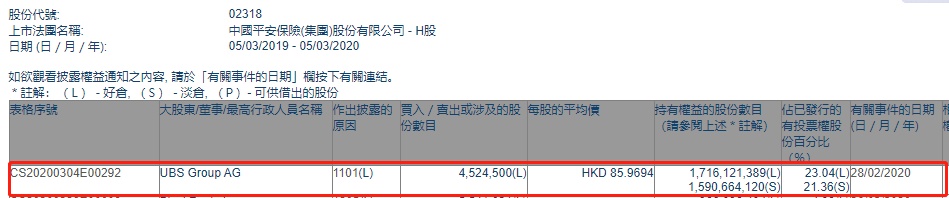 智通财经APP获悉,联交所最新资料显示,2月28日,瑞银集团(UBS Group AG)增持中国平安(02318)452.45万股,每股作价85.9694港元,总金额约为3.89亿港元,增持后持股数目约为17.16亿股,持股比例为23.04%。
