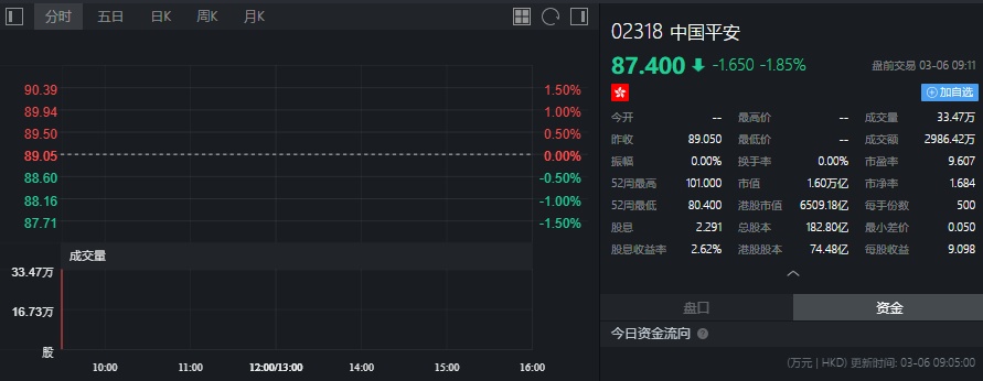 今日盘前交易时段,截至发稿,中国平安跌1.85%,报87.40港元。