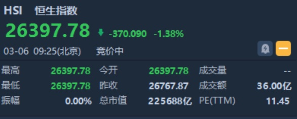智通财经APP获悉,恒生指数开盘跌370.09点或1.38%,报26397.78点。国企指数跌1.58%,报10558.72点。红筹指数跌1.12%,报4163.85点。大市盘前成交36.01亿港元。
