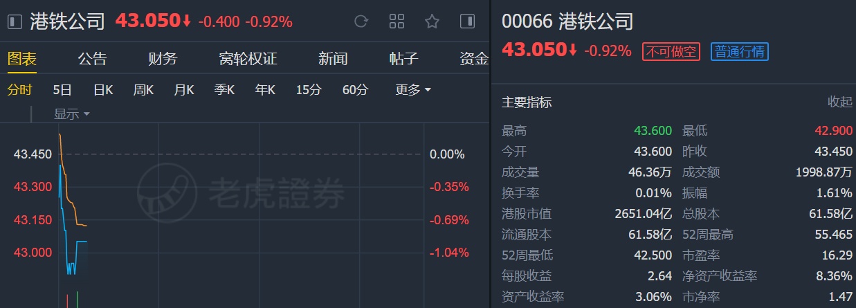 该行表示,已分别下调对港铁2020年和2021年的盈利预测22%和14%。港铁截至去年底止全年纯利119.32亿港元,同比跌25.5%,每股盈利1.94港元,派末期息每股0.98港元。全年合共派息1.23港元,升2.5%。去年基本业务利润同比跌6.2%至105.6亿港元,经常性业务利润同比跌44.8%至49.8亿港元。