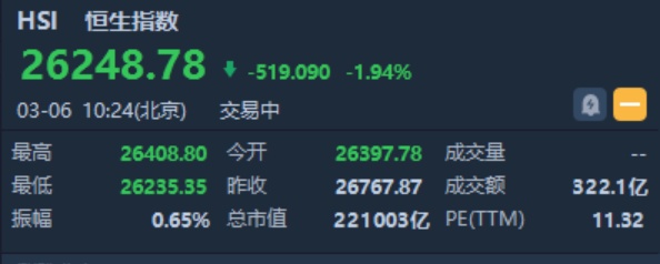 智通财经APP获悉,恒指早盘低开低走盘中跌超500点,蓝筹股集体走弱,仅石药集团(01093)逆市上涨1.07%。截至10时24分,恒指跌519.09点或1.94%,报26248.78点,成交额暂为321.1亿。