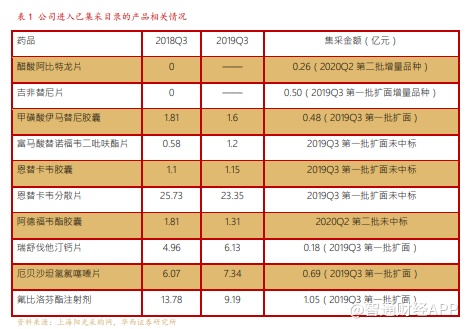 第一轮和第二轮集采对公司业绩产生最大影响的主要是肝炎抗病毒的恩替卡韦、替诺福韦、阿德福韦酯等系列产品,对 2020 年的收入影响预计 20 亿元左右。其次镇痛的氟比洛芬酯注射剂、心脑血管的瑞舒伐他汀、厄贝沙坦氢氯噻嗪也有较大影响,对 2020 年收入影响共计约 10 亿元。但是随着布地奈德混悬液、利多卡因凝胶、托法替布、孟鲁司特、福多司坦、西格列汀等新品种放量,能够弥补收入端受集采的影响,维持一定的增长。