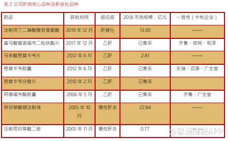 肝病是公司最核心的专科领域,主要是保肝降酶和抗肝炎病毒两大类药物。保肝降酶的甘草酸二铵胶囊和注射剂(甘平、甘利欣)、异甘草酸镁注射液(甘美)销售额预计保持稳定。抗肝炎病毒类的恩替卡韦胶囊、恩替卡韦分散片、富马酸替诺福韦二吡呋酯片、阿德福韦酯胶囊由于在第一批集采扩面、第二批集采中未能中标,预计 2020 年销售会有较为明显下降。