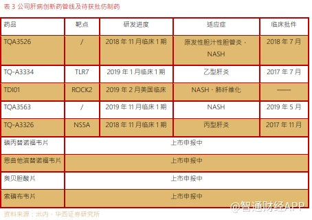 NASH、乙肝的功能性治愈是目前肝病领域创新药物研发的热点,公司在 NASH 领域布局两个创新药物均处于临床早期,海外重磅品种奥贝胆酸公司是国内独家申报企业。TQ-A3334 是一种新型高选择性 TLR7 激动剂,与大型跨国药企强生进行合作正在开展 2 期临床,有望实现乙肝的功能性治愈,想象空间巨大。