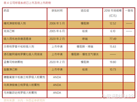 公司目前吸入用布地奈德混悬液 2020 年 2 月已首仿获批上市,另一款雾化吸入产品酒石酸阿福特罗雾化吸入用溶液处于上市申请阶段;其中前者 2018 年市场规模 77 亿元。