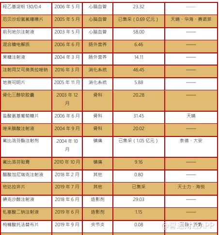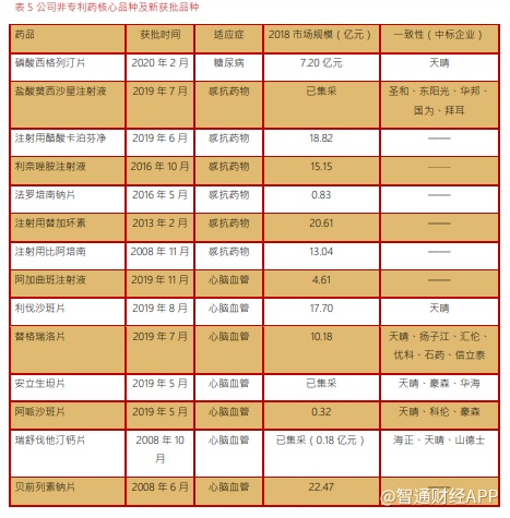 镇痛、心脑血管用药由于有大品种被集采,预计 2020 年小幅负增长。骨科、消化系统、抗感染、肠外预计稳定增长,糖尿病用药有多款列汀、列净上市申请或已获批,预计高速增长。另外公司造影剂开始放量贡献业绩,托法替布、凝血八因子均是数十亿级别重磅品种。