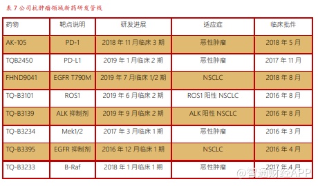 公司在肺癌领域还单独立项布局了 TQ-B3139(ALK 抑制剂)、TQ-B3101(Ros1 抑制剂)两个创新药,做到了在肺癌领域基本实现了全面覆盖。目前这两个创新药均处于临床 2 期研究,有望以 2 期临床数据有条件上市申请。