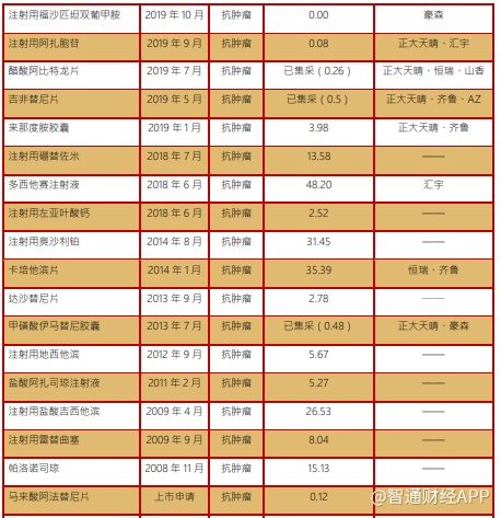雷替曲塞医保谈判价格 669 元每支,较谈判前挂网价格 1500 元降价幅度 55.40%。公司雷替曲塞 2018 年的销售额为 5.12 亿元,结直肠癌患者接受雷替曲塞化疗每次需要使用 3 支药物,一般接受 6 个周期的化疗,按照 1500 元每支药物折算每个患者治疗用药费用 2.7 万,按照销售额折算雷替曲塞覆盖患者约 1.90 万。根据国家癌症统计,2015 年我国结直肠癌患者 37.63 万人,并以年均 2%的增速增长,2020 年预计年新发患者达到 41.55 万人。虽然雷替曲塞进医保降价 55.40%,但是进医保后预计渗透率将会大幅提升,目前仅 5%的渗透率还有很大的覆盖空间,预计雷替曲塞销售额峰值将超 10 亿元。
