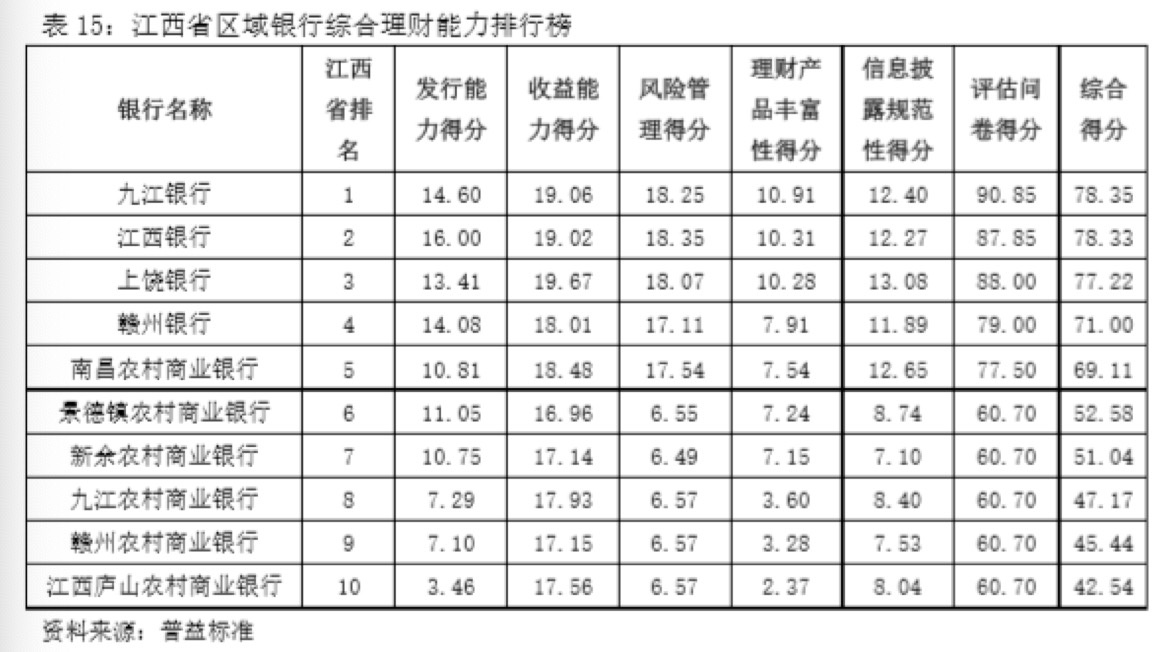 各单项排名结果显示,九江银行的理财产品丰富性位居该省第一名;江西银行的发行能力、风险管理能力位居该省第一名;上饶银行的收益能力、信息披露规范性位居该省第一名。