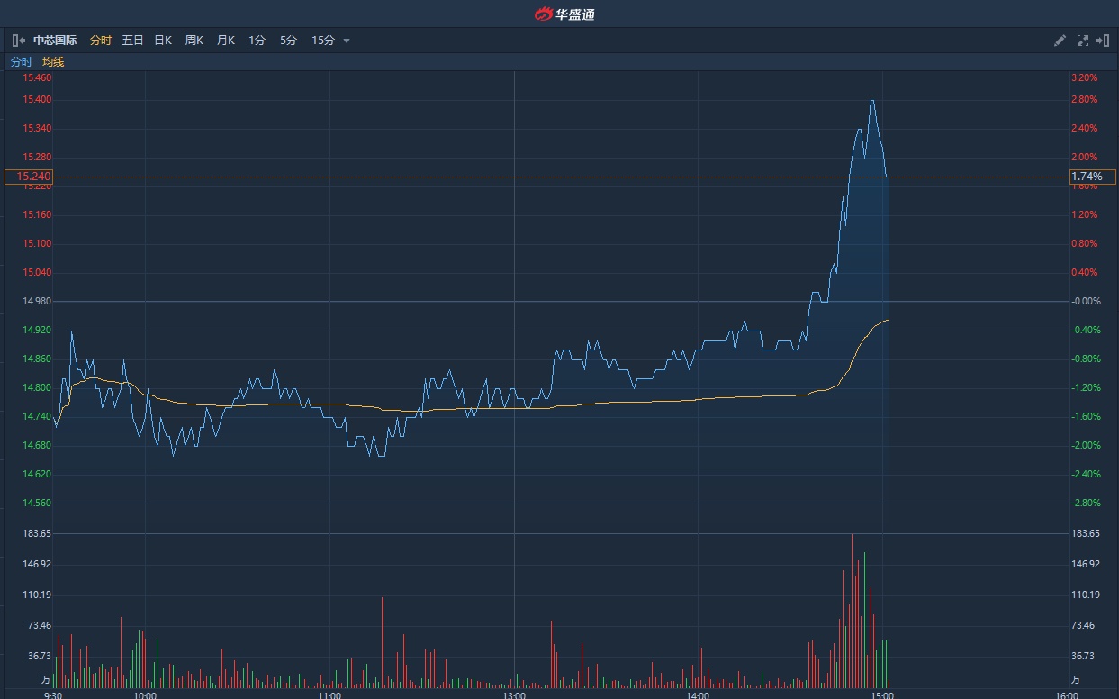 智通财经APP获悉,据羊城晚报报道,3月4日,中芯国际集成电路制造(深圳)有限公司从荷兰进口的一台大型光刻机顺利通过出口加工区场站两道闸口进入厂区。据悉,这台机器主要用于企业复工复产后的生产线扩容。中芯国际(00981)午后突获资金扫货,股价由跌转涨近3%,截至发稿,涨1.47%,报15.2港元,成交额8.23亿港元。