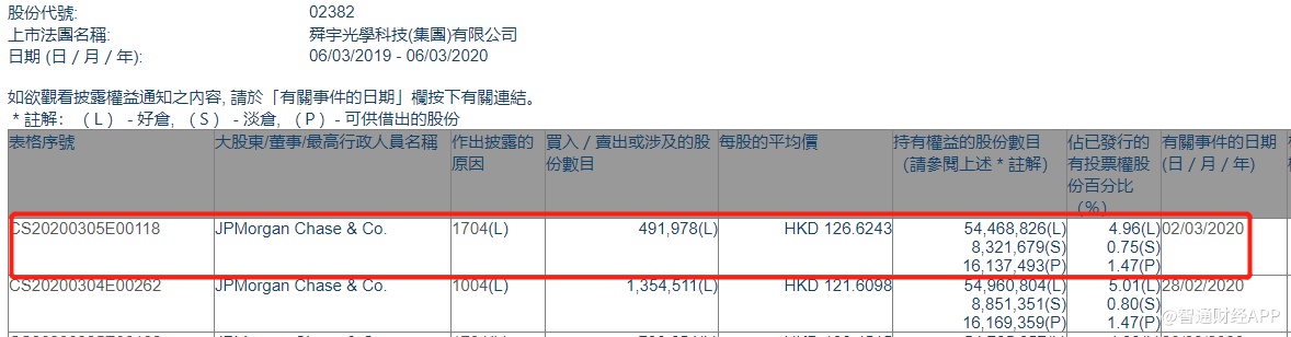 智通财经APP获悉,联交所最新资料显示,3月2日,摩根大通减持舜宇光学(02382)约49.2万股,每股作价126.6243港元,涉及总金额约为6229.92万港元。减持后最新持股数目约为5446.88万股,最新持股比例4.96%。