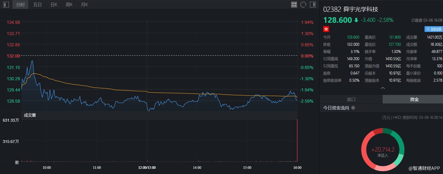 截至今日收盘,舜宇光学(02382)跌2.58%,报128.60港元。