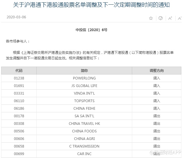 智通财经APP获悉,3月6日,上海证券交易所发布《关于沪港通下港股通股票名单调整及下一次定期调整时间的通知》。