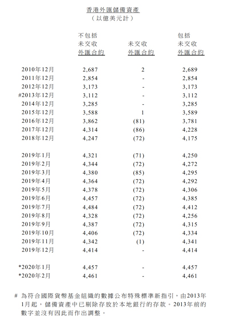 今年2月底及1月底并无未交收外汇合约。4461亿美元的外汇储备资产总额,相当于香港流通货币的六倍多,或港元货币供应M3约46%。