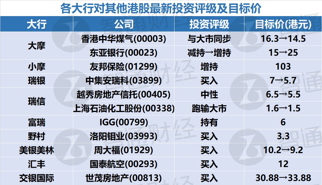 六、各大行对其他港股最新投资评级及目标价