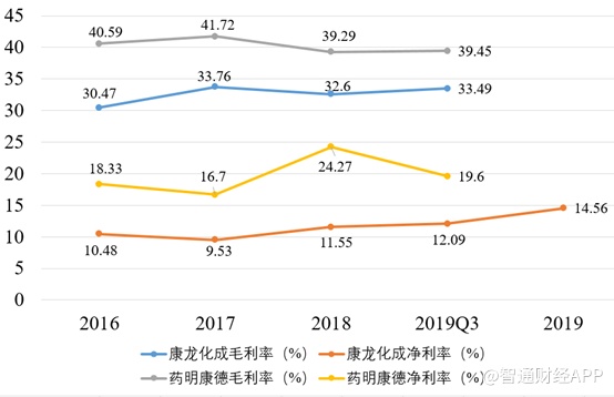 智通财经APP统计了2016年至2019Q3两家药企的毛利率和净利率,药明康德的平均毛利率为40.3%,而康龙化成的平均毛利率为32.6%,相差约8个百分点。药明康德平均净利率约为19.7%,康龙化成平均净利率只有10.9%,相差约8.8个百分点。2019年康龙化成综合净利率增至14.56%,使之近四年平均净利率为11.5%,不过依旧与药明康德有明显差距。