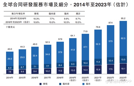 智通财经APP发现其中临床开发服务占比最大,这也是近些年康龙化成逐步将后期开发阶段延伸的原因。而整体行业符合增速不及康龙化成及药明康德营收增速,这说明CRO行业的集中度仍在提升,这对其是一利好。
