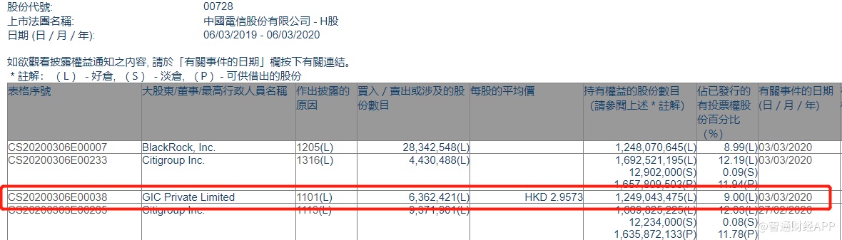 智通财经APP获悉,联交所最新资料显示,3月2日,GIC Private Limited增持中国电信(00728)约636.24万股,每股作价2.9573港元,涉及总金额约为1881.55万港元。增持后最新持股数目约为12.49亿股,最新持股比例9.0%。