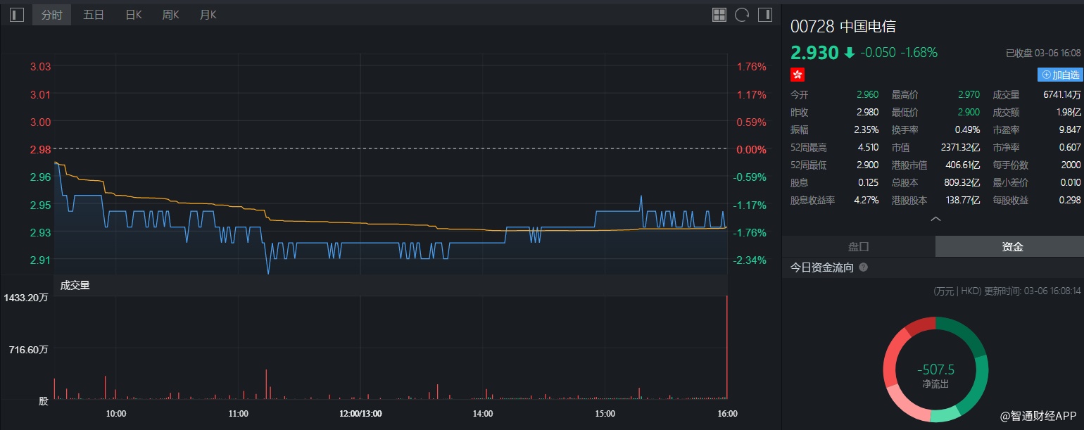 截至今日收盘,中国电信(00728)跌1.68%,报2.93港元。