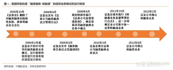 我国采取的是“融资融券-转融通”的信用业务模式和运行框架。2005年10月,《证券法》删除了对融资融券的限制性条款,券商融资融券业务合法化。2006年2月起,证监会开始分析当时资本市场以及证券行业的发展状况,针对我国的融资融券业务模式、运行框架和规则进行全面系统的顶层设计研究。2006年6月,中国证监会发布《证券公司融资融券试点管理办法》。2006年8月,中国证监会发布《融资融券交易试点实施细则》。2008年6月,国务院颁布施行《证券公司监督管理条例》,确定我国采用融资融券业务集中模式-“证券公司从事融资融券业务,自有资金或者证券不足的,可以向证券金融公司借入”。2010年3月,中国证监会推出证券公司融资融券业务试点。2011年10月,中国证监会颁布施行《转融业务监督管理实行办法》,进一步明确中国证券金融公司集中统一运营转融通业务。2012年8月和2013年2月,中国证券金融公司分别推出转融资、转融券业务,标志着“融资融券-转融通”的信用业务模式和运行框架基本形成。