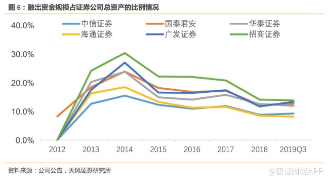从资产负债表的角度看,融出资金规模占证券公司的总资产比例在11%-23%之间,受市场波动影响较大。2016年至今,券商的资金配置方面是从融资类转向投资类为主,我们统计范围内的6家证券公司的融出资金规模占总资产的比例整体是逐年下降的,截至2019年前三季度,中信证券、国泰君安、华泰证券、海通证券、广发证券和招商证券的融出资金规模占各自总资产的比例分别为9.2%、12.6%、11.9%、8.1%、13.2%和13.8%,平均值为11.5%。