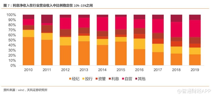 从利润表的角度看,融资融券业务拓宽了证券公司业务范围,增加了证券公司收入来源,改善了证券公司盈利模式。我们对比2010年至2019年之间,证券行业的收入结构,可以发现经纪业务的收入占比从55.9%下降至2019年的21.8%,收入占比退居次席。利息净收入的占比从2010年的8.1%提升至2019年的12.9%,是行业第四大收入来源。