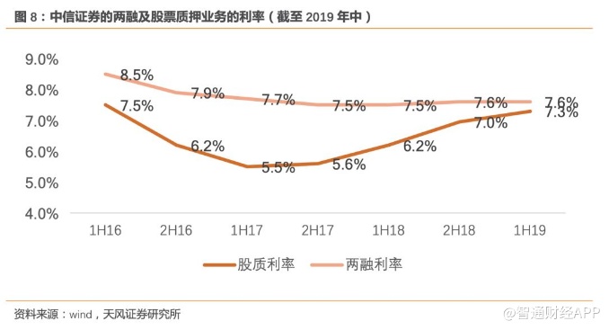 根据中国证监会发布的《证券公司融资融券业务管理办法》,融资利率、融券费率由证券公司与客户自主协定,但融资利率不得低于中国人民银行规定的同期金融机构贷款基准利率。经过近10年的发展,融资融券的利率的高低基本已由市场决定,以中信证券为例2016年中至2019年中的融资融券的利率在7.6%-8.5%之间波动。