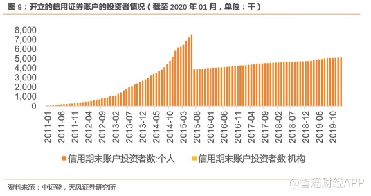 融资融券业务满足了大量投资者群体的需求。经过近10年的发展,沪深两市融资融券规模和客户基础均得到显著的提升,现阶段不仅成为证券公司的主要收入来源(利息收入占比接近10%),更是投资者特别是个人和一般机构投资者进行信用交易股票的主要手段,根据中国证券登记结算有限公司公布的最新数据,截至2020年1月,融资融券客户首次突破500万人,达到512万人,其中个人客户占比高达99%。