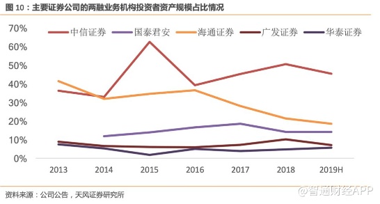 现阶段一般机构投资者的账户数量占比仅为1%左右,但是我们观察主要证券公司(中信证券等5家)的融资融券业务的中机构投资者的资产占比相对较高。其中,中信证券2013年-2019年中,两融业务机构投资者资产规模占比平均为45%,2015年更是达到了63%,远高于其他可比券商。